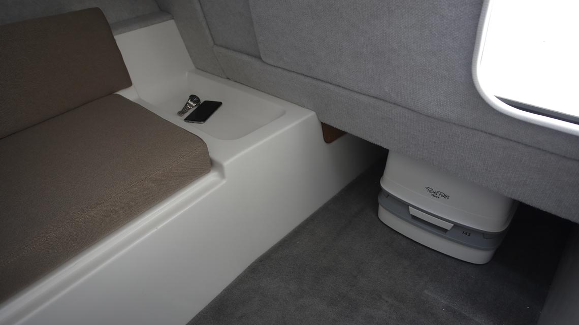• Ευρύχωρη καμπίνα για ύπνο δύο ενήλικων, με φινιστρίνια φωτισμού – αερισμού, χώρο για κρυφή χημική τουαλέτα και προαιρετική εγκατάσταση τραπεζιού
